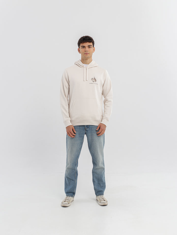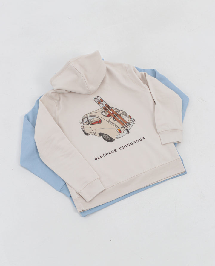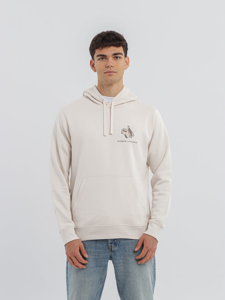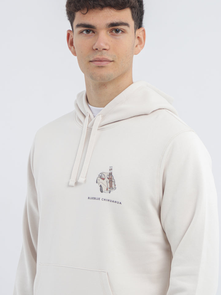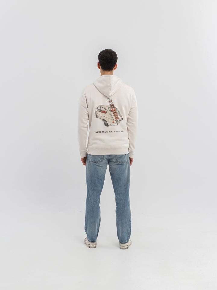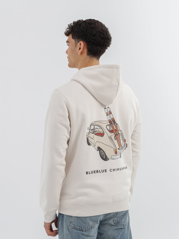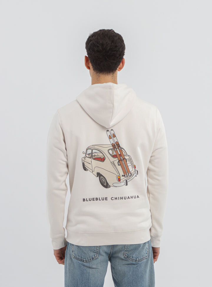 Sudadera color blanco roto de algodón orgánico con estampado de nuestro famoso 600. Diseñada para los amantes de nuestro mítico coche y uno de nuestros deportes favoritos.